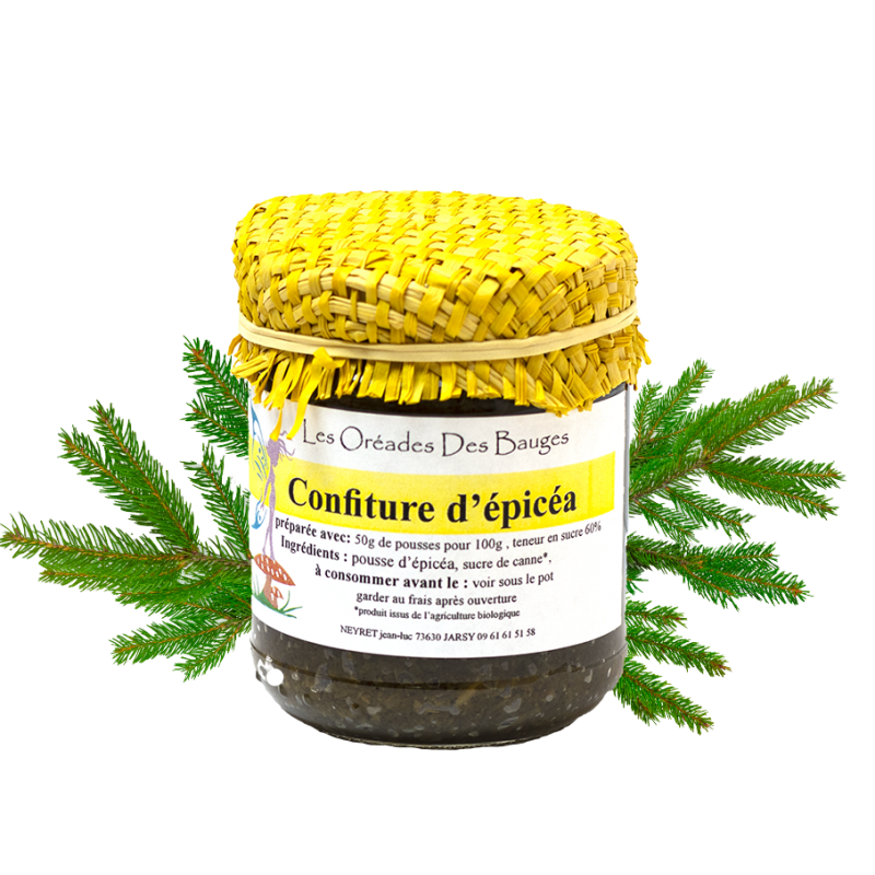 Confiture produite par Jean-Luc Neyret, cueilleur confiturier, à partir des bourgeons d'épicéa ramassés lors de ses cueillettes dans le massif des Bauges.