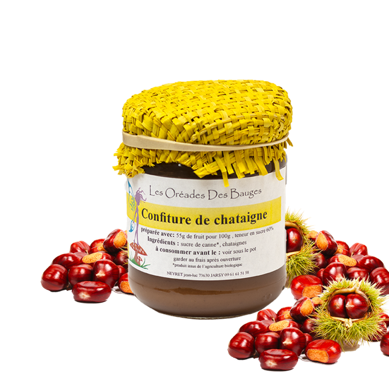Confiture produite par Jean-Luc Neyret, cueilleur confiturier, à partir de châtaignes ramassées lors de ses cueillettes dans le massif des Bauges.
