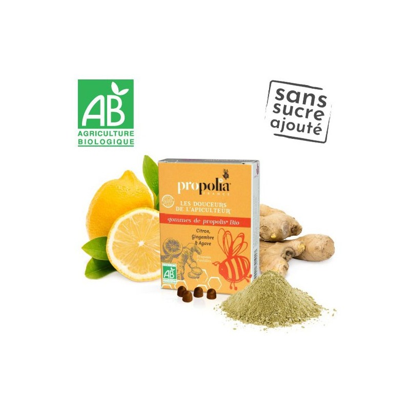 Gomme arabique* (épaississant), Sirop d’agave (Agave tequilana)* 47%, Extrait de propolis purifiée* origine Europe et Amérique du Sud 3%, Extrait sec de Gingembre* 1.8%, Arôme naturel de Citron*